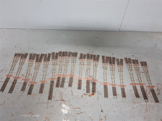I finally managed to get out into the shed again this weekend. The first task was to pre-weather the turnout and diamond cross over that I had made. Once the pre-weathering was completed and paint was let to dry, it was onto one of the most enjoyable parts of building a railroad, the track work.